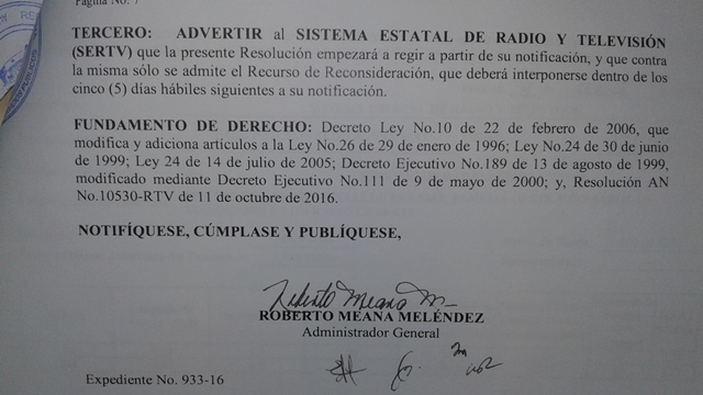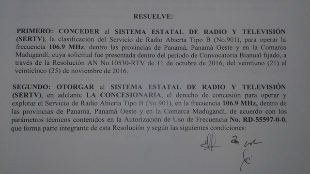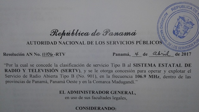 Recientemente, el licenciado Pacífico Leonardo Alvarado, Director General del Sistema Estatal de Radio y Televisión junto a su equipo de trabajo se presentó ante Autoridades de la Autoridad Nacional de los Servicios Públicos (ASEP), con el propósito de notificarse de forma presencial y formal, de la Resolución AN No.11106-RTV, mediante la cual se concede la clasificación de servicio Tipo B al SISTEMA ESTATAL DE RADIO Y TELEVISIÓN (SERTV) y se le otorga la concesión para operar y explotar el Servicio de Radio Abierta Tipo B (No.901), en la frecuencia 106.9 MHz, dentro de las provincias de Panamá, Panamá Oeste y en la comarca Madugandí.