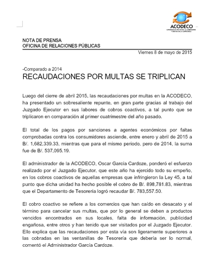 Luego del cierre de abril 2015, las recaudaciones por multas en la ACODECO, ha presentado un sobresaliente repunte, en gran parte gracias al trabajo del Juzgado Ejecutor [...]