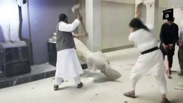Un hombre del Estado Islámico monta sobre una enorme escultura [...]