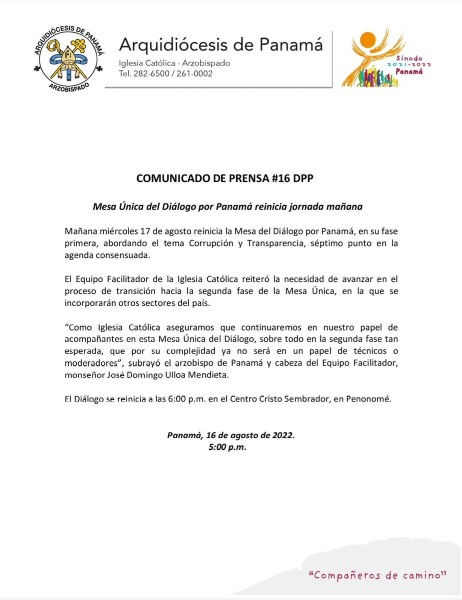 La Arquidiócesis de Panamá, por medio de Comunicado de Prensa [...]