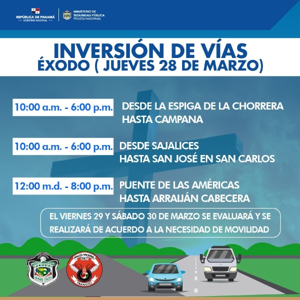 El Subcomisionado, Luis Hernández, indicó que, la inversión de carriles iniciará el jueves 28 de marzo de 10:00 a.m. a 06:00 p.m., desde La Espiga de La Chorrera, hasta Campana de Capira, y en ese mismo horario desde Sajalices de Chame, hasta San José de San Carlos en tanto de 12:00 md a 08:00 p.m. habrá inversión desde Puente de Las Américas hasta Arraiján.