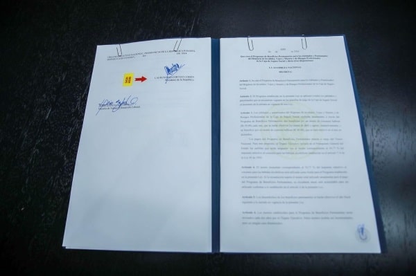 El documento, señala que, los jubilados y pensionados del Régimen de Invalidez, Vejez y Muerte y de Riesgos Profesionales de la Caja de Seguro Social, recibirán anualmente, a través de este programa, dos beneficios por un monto de cincuenta balboas (B/.50.00) cada uno, que se harán efectivos los meses de abril y agosto, respectivamente, y un beneficio por un monto de cuarenta balboas (B/.40.00), que se hará efectivo en el mes de diciembre.