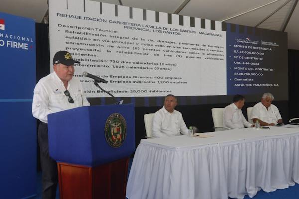 El Presidente de la República de Panamá, José Raúl Mulino, dio este jueves, 27 de marzo, la orden de proceder para los trabajos del proyecto de rehabilitación de la carretera La Villa de Los Santos – Macaracas, el primer contrato licitado al inicio de esta administración bajo una inversión final de B/. 28, 788,000.00 millones de balboas.