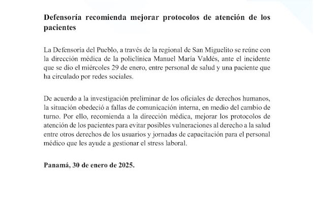Defensoría recomienda mejorar protocolos de atención de los pacientes