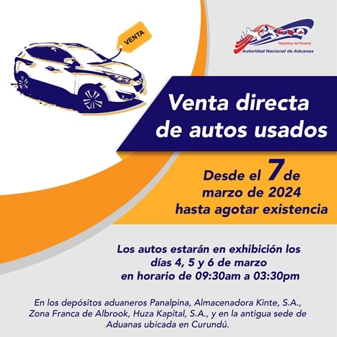 Para este objetivo, se ha establecido un proceso de exhibición los días 4, 5 y 6 de marzo del presente año. Los interesados, podrán adquirir el formulario denominado “Venta Directa” a un costo de B/.3.00 en los depósitos aduaneros de la Zona Oriental donde están ubicados los autos: Almacenadora Kinte S.A., Panalpina, Zona Fran Procesadora de Albrook, Huza Kapital S.A. y en la antigua sede de Aduanas ubicada en Curundu.