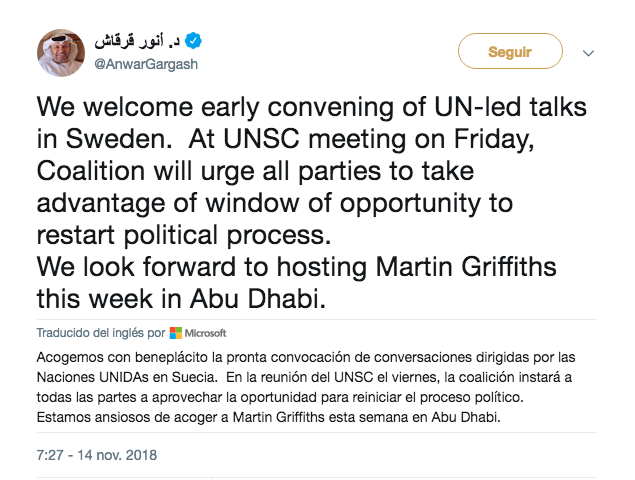 «Apoyamos la convocatoria lo antes posible de conversaciones dirigidas por la ONU en Suecia», afirmó el ministro de Relaciones Exteriores de Emiratos, Anwar Gargash, en un tuit.