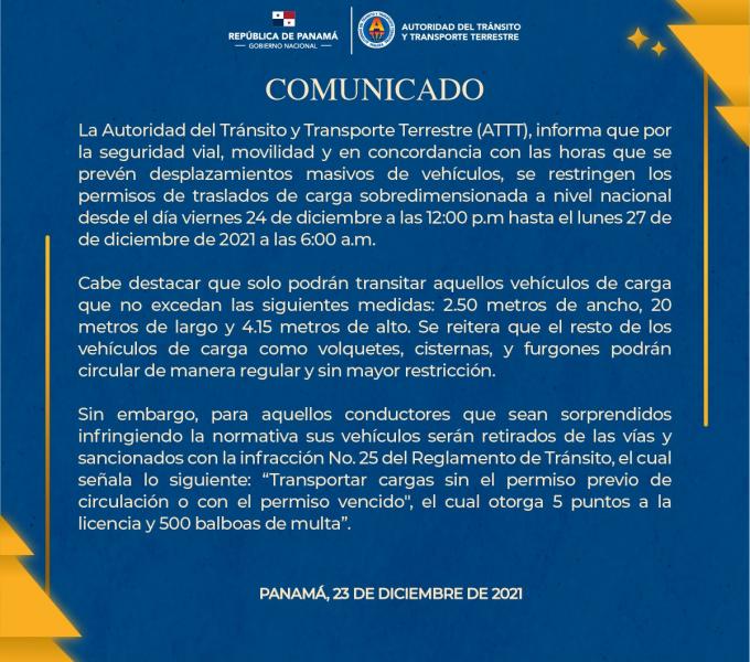 La Autoridad del Tránsito y Transporte Terrestre (ATTT), informa que, por la seguridad vial, movilidad y en concordancia con las horas que se prevén desplazamientos masivos de vehículos, se restringen los permisos de traslados de carga sobredimensionada a nivel nacional desde el día viernes 24 de diciembre a las 12:00 p.m, hasta el lunes 27 de diciembre de 2021 a las 6:00 a.m.