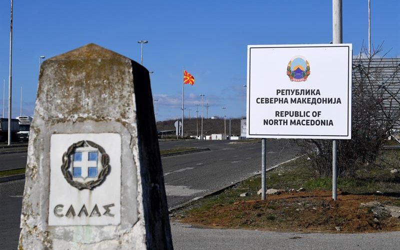 Las autoridades estaban reemplazando el miércoles los carteles de entrada al país en un puesto fronterizo con Grecia.