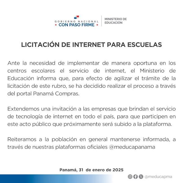 Extendemos una invitación a las empresas que brindan el servicio de tecnología de internet en todo el país, para que participen en este acto público que próximamente será subido a la plataforma. Reiteramos a la población en general mantenerse informada a través de nuestras plataformas oficiales @meducapanama