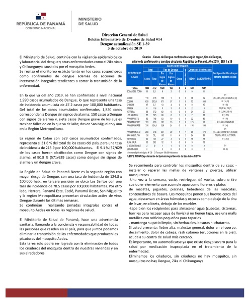 En lo que va del año 2019, se han confirmado a nivel nacional 1,990 casos acumulados de dengue, lo que representa una tasa de incidencia acumulada de 47.2 casos por 100,000 habitantes; del total de los casos acumulados confirmados, 1,820 casos corresponden a dengue sin signos de alarma; 150 casos con signos de alarma y 7 graves, de los cuales tres han fallecido, dos personas en San Miguelito y una persona en la Región Metropolitana.