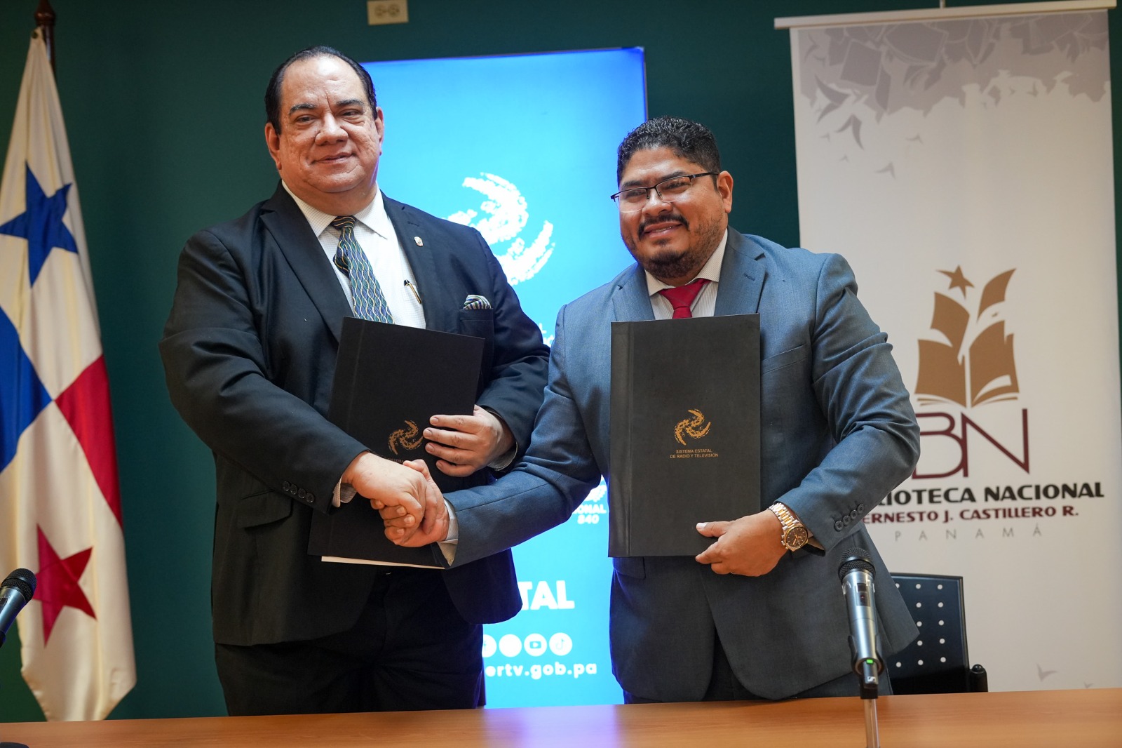 El acuerdo fue suscrito por Dustin Guerra, director general de SERTV y Fernando Gómez Arbeláez, presidente de la Junta Directiva de la Fundación Pro Biblioteca Nacional. Acompañaron esta ceremonia distinguidos representantes de ambas entidades. Por parte de SERTV, Sara Moreno, subdirectora general de Televisión; Eusebio Cedeño, secretario general; Ana Cruz, directora de Programación e Inés Vega, directora de Asesoría Legal. Por parte de la Biblioteca Nacional también estuvieron María Magela Brenes, directora general; Guadalupe de Rivera, directora Técnica; Jorge E. Ritter, subtesorero y Cristina Lara De Rowe, subsecretaria de la Fundación.