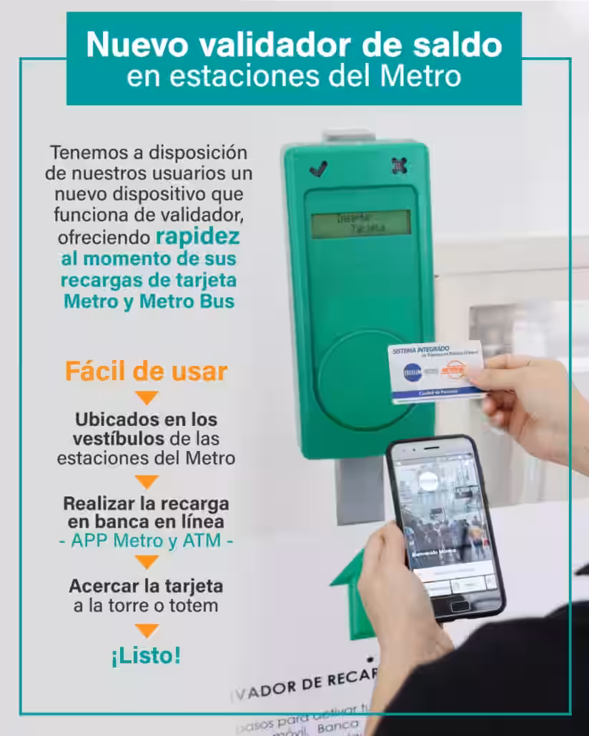 Desde el pasado jueves 16 de abril, Metro de Panamá cuenta con un dispositivo validador que ofrecerá mayor rapidez al usuario al momento de sus recargas de tarjeta Metro y Metro Bus.