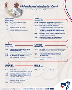 Francisco saldrá de Roma hacia Panamá a las 9:35 am y arribará a suelo panameño a las 4:30 p.m. del miércoles 23 de enero. El jefe del Vaticano tendrá una agenda oficial en donde se reunirá con autoridades gubernamentales, jóvenes peregrinos que participan en la JMJ, además,  del Centro de Cumplimiento de menores en Las Garzas de Pacora, dedicación al Altar de la Catedral Santa María La Antigua, y una visita al Hogar Buen Samaritano, también un Centro de acogida para pacientes que padecen VIH – Sida,  y compartirá con los jóvenes en el Seminario Mayor San José.
