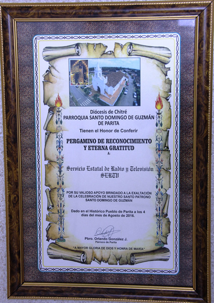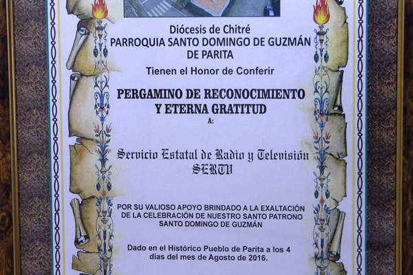 La Parroquia Santo Domingo de Guzmán de Parita, perteneciente a la Diócesis de Chitré en la provincia de Herrera, entregó Pergamino de Reconocimiento y Eterna Gratitud al Sistema Estatal de Radio y Televisión (SERTV), por el valioso apoyo brindado a la exaltación de la celebración del Santo Patrono Santo Domingo de Guzmán.
