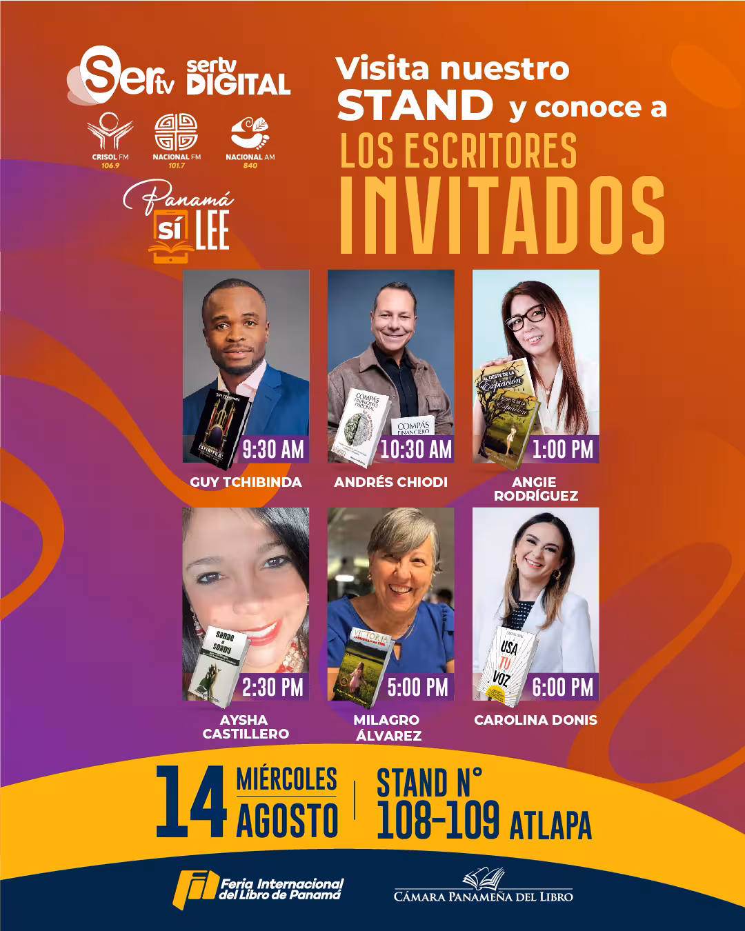Cincuenta (50) talentosos escritores, entre panameños e internacionales, se apoderarán del stand de SERTV desde hoy martes 13 de agosto hasta este domingo 18 de agosto de 2024. Acérquese a los stands 108 y 109 en Los Tapices de Atlapa para que tenga la oportunidad de conversar directamente con los escritores invitados, comprar sus libros autografiados y así obtener las mejores obras del evento ferial literario más esperado del año.